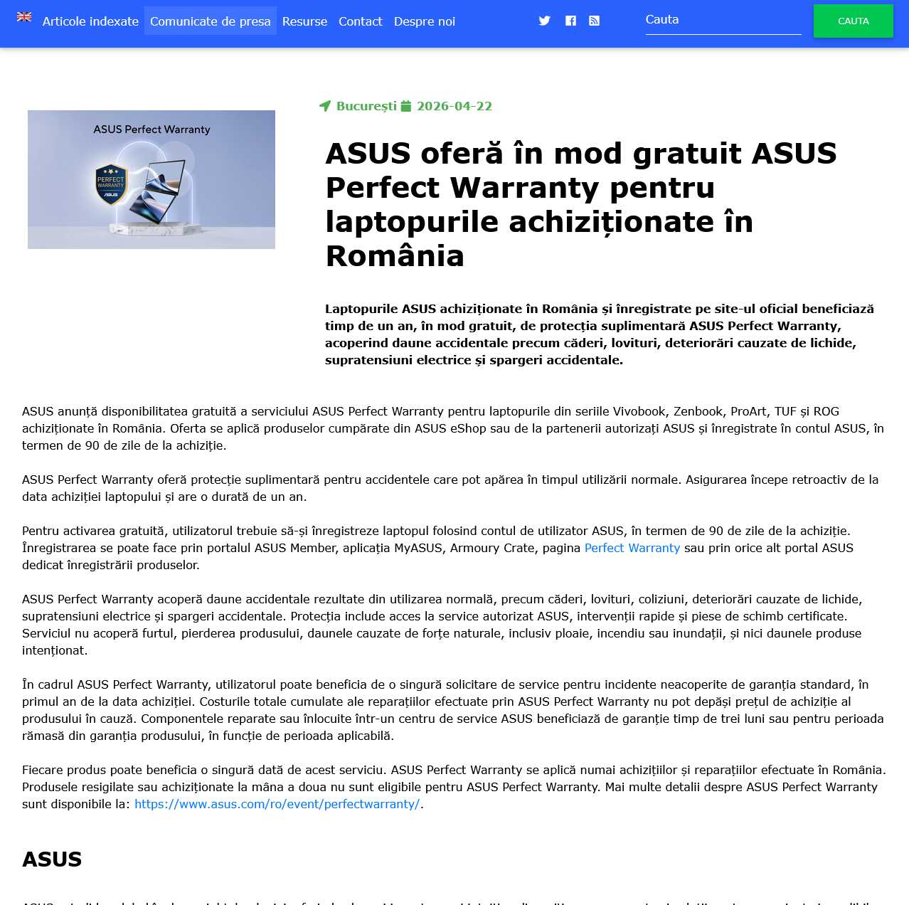 ASUS offers ASUS Perfect Warranty free of charge for laptops purchased in Romania