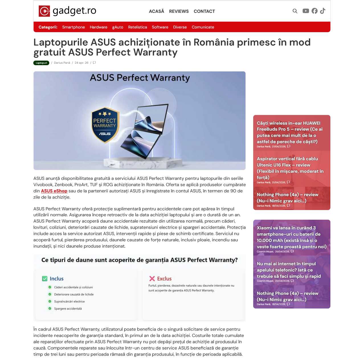 ASUS offers ASUS Perfect Warranty free of charge for laptops purchased in Romania