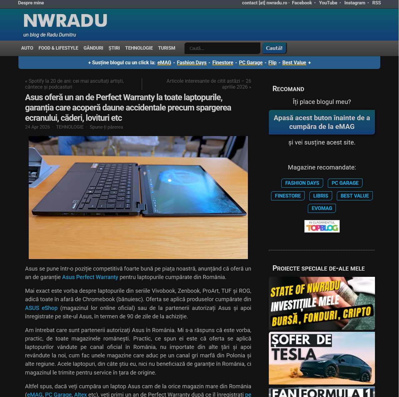 ASUS offers ASUS Perfect Warranty free of charge for laptops purchased in Romania