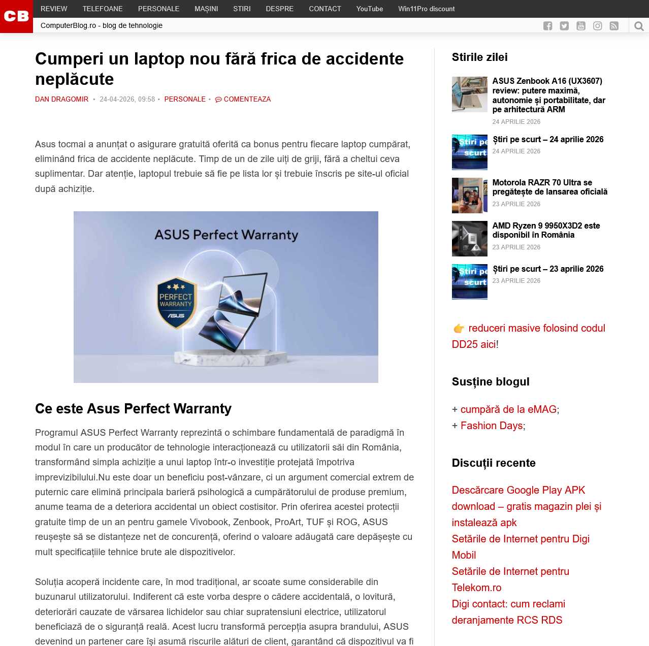 ASUS offers ASUS Perfect Warranty free of charge for laptops purchased in Romania