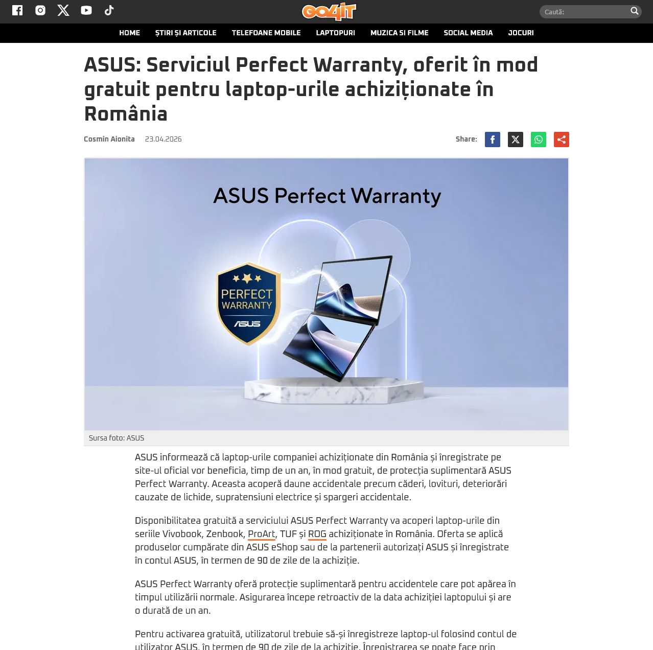 ASUS: Serviciul Perfect Warranty, oferit in mod gratuit pentru laptop-urile achiziționate in Romania