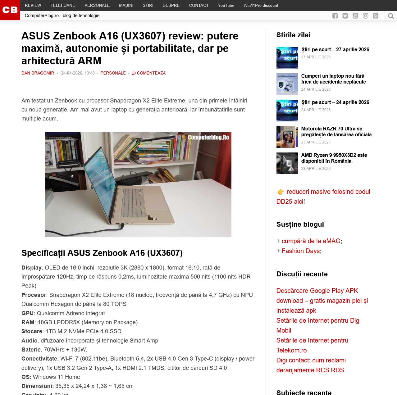 ASUS Zenbook A16 (UX3607) review: putere maxima, autonomie și portabilitate, dar pe arhitectura ARM